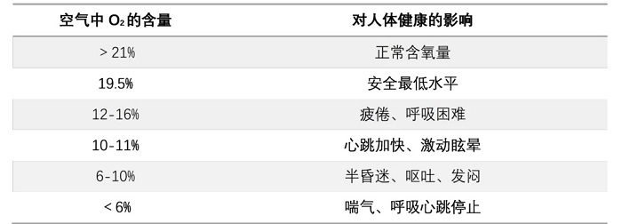 空氣中氧氣的正常含量是21%,19.5%是對人體產生影響的臨界值。當氧氣濃度低于19.5%時,人們會呼吸加速,感到疲勞無力;低于12%時會呼吸困難,低于10%時會嘔吐、無法行動、失去意識甚至死亡。