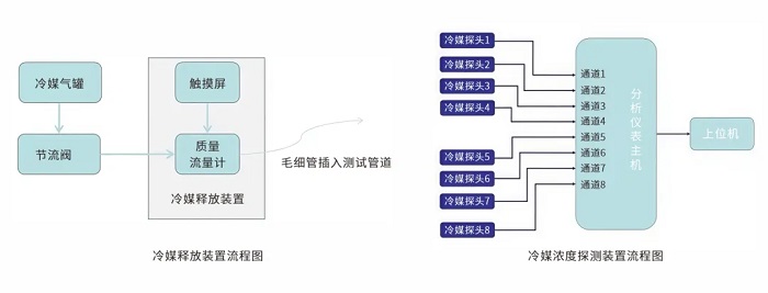 若經(jīng)驗法則在復雜工況中存在不確定性,還可通過科學測試精準錨定最佳安裝位?!陡戒汳M冷媒傳感器位置確認測試》是UL定義的一項關鍵驗證程序,基于測試要求研發(fā)設計的附錄MM實驗裝置主要由冷媒釋放裝置和冷媒濃度探測裝置組成。冷媒釋放裝置能夠精確調(diào)控冷媒氣體的釋放流量,并借助毛細管將氣體精準導入空調(diào)或熱泵的相應管道之中。與此同時,分布在測量設備不同位置的冷媒濃度探測裝置,可迅速捕捉各測量點的氣體濃度信息,并將數(shù)據(jù)以曲線圖形式實時呈現(xiàn)在上位機。通過對不同位置所測得的冷媒氣體濃度數(shù)據(jù)進行分析,能夠科學地確定傳感器的最佳安裝位置。