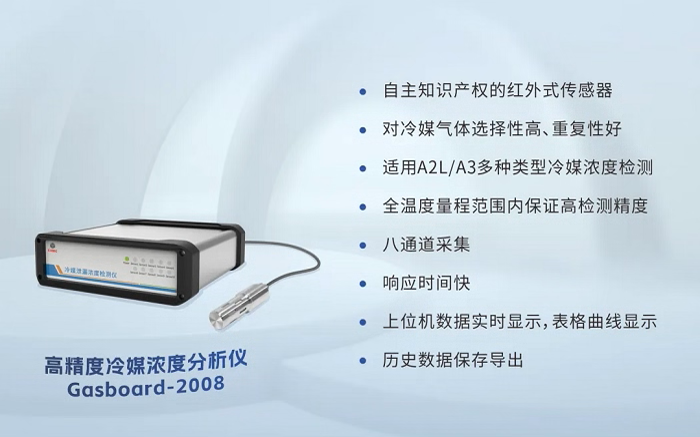 冷媒濃度探測裝置是四方光電自主研發(fā)的高精度冷媒濃度分析儀,采用紅外傳感器,共有8個檢測通道,可檢測多種A2L/A3冷媒,并通過上位機進行實時數(shù)據(jù)顯示。