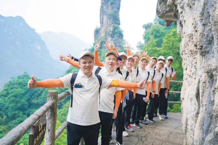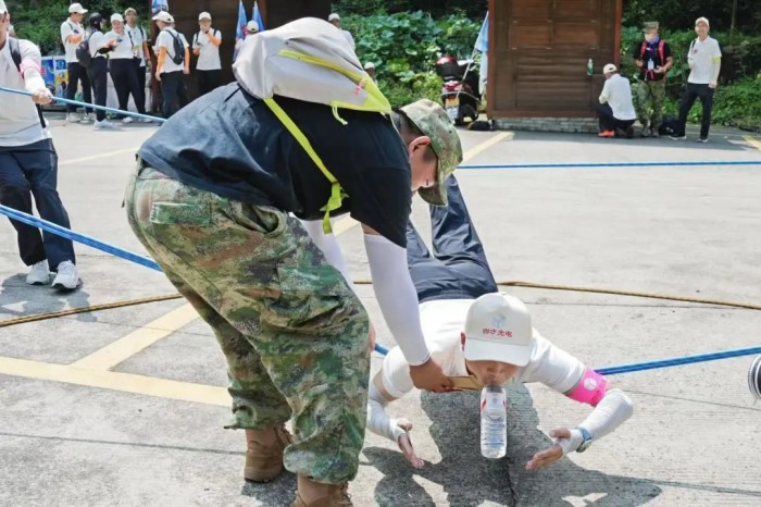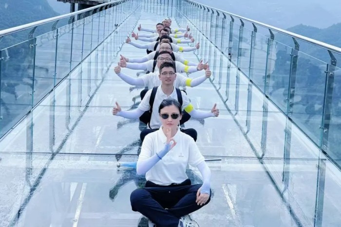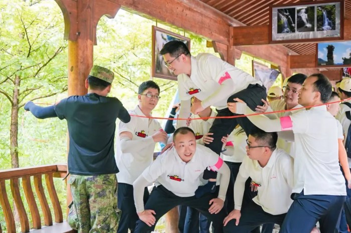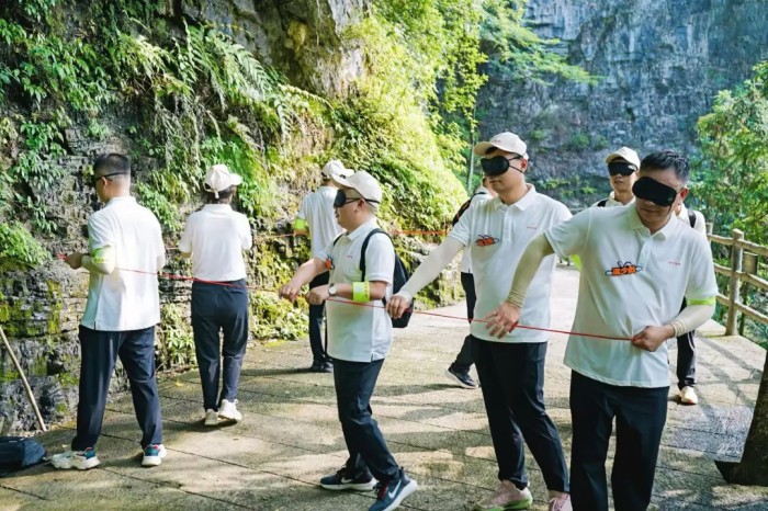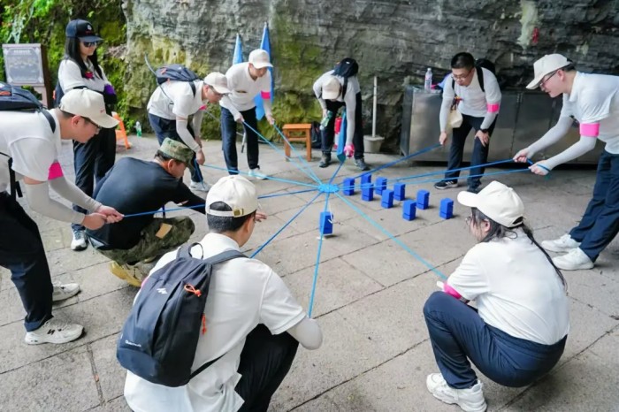 出征儀式結(jié)束后,隊員們迎來本次淬煉之旅的第一個挑戰(zhàn)——清江方山8.5公里徒步。參訓(xùn)人員互幫互助,克服山路、高溫、降雨等自然挑戰(zhàn),直面懸崖玻璃棧道恐懼。行進中各支隊伍穿插完成多項團隊協(xié)作項目,在"雷區(qū)取水"中展現(xiàn)智慧與默契,在"穿越封鎖線"中培養(yǎng)信任與配合,通過"盲人方陣"磨練溝通技巧,借助"步步高升"提升協(xié)作能力。各支隊伍還圓滿完成了微電影拍攝任務(wù),大家群策群力、各展所長,用鏡頭記錄下這段難忘的淬煉時光。