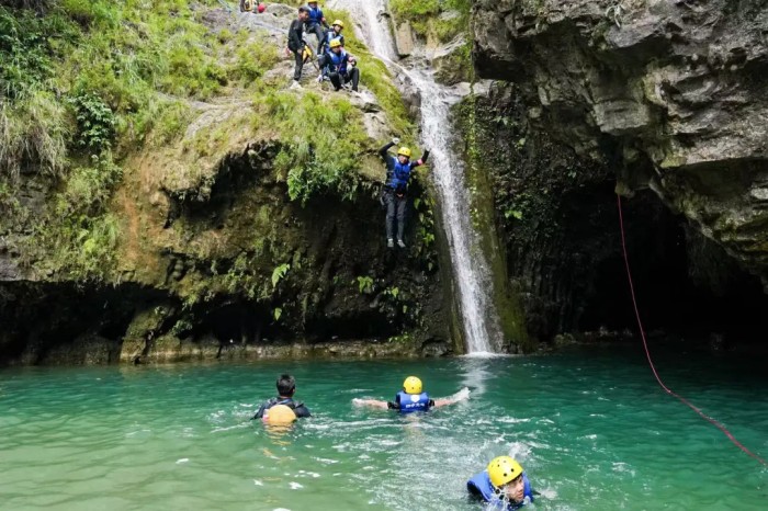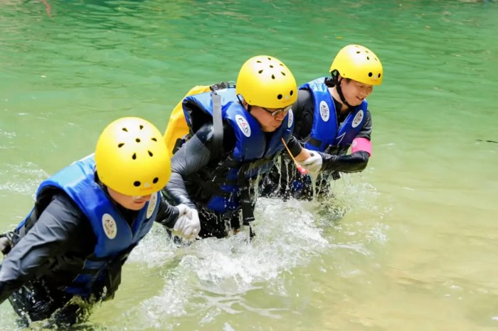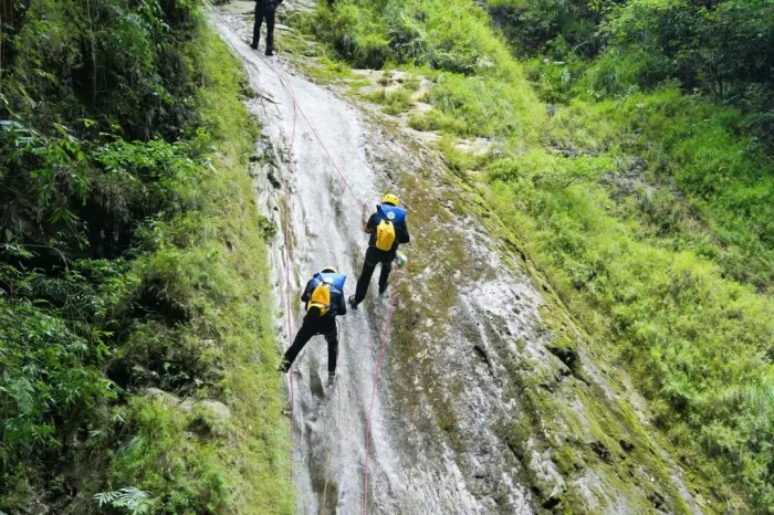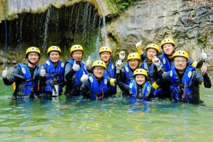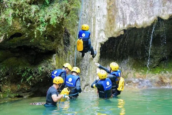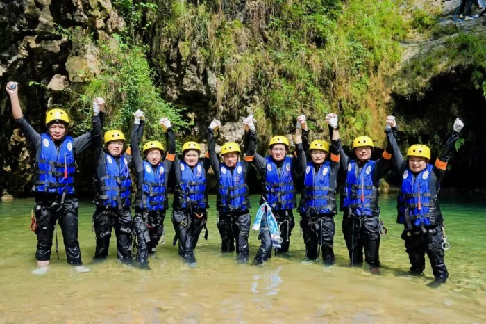 7月12日清晨,6支隊伍再度集結(jié),進行更具挑戰(zhàn)性的戶外項目。在險峻的峽谷之間,參訓(xùn)隊員完成了近4公里溯溪,以及驚心動魄的10米、40米瀑降,最后是終極挑戰(zhàn)5米跳潭,所有隊員無一人退縮,戰(zhàn)勝恐懼勇敢一躍。在這一天的極限挑戰(zhàn)中,參訓(xùn)隊員始終把集體榮譽擺在首位,在挑戰(zhàn)中主動擔(dān)當(dāng)、互相鼓勵,不僅圓滿完成任務(wù),更展現(xiàn)出了運營團隊出色的凝聚力、戰(zhàn)斗力和執(zhí)行力。