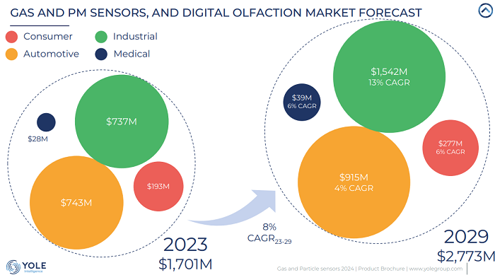 近日,國外權(quán)威咨詢機構(gòu)Yole Intelligence發(fā)布報告《Gas and Particle sensors 2024》,報告對氣體和粉塵傳感器全球市場進行了調(diào)研,分析了氣體和粉塵傳感器的市場現(xiàn)狀、具體的細分市場和未來發(fā)展趨勢,報告顯示氣體和粉塵傳感器市場在2023年至2029年間增長 8%,到2029年市場總規(guī)模將達到約 28 億美元,在消費、工業(yè)、汽車和醫(yī)療這4大領(lǐng)域都有所增長。