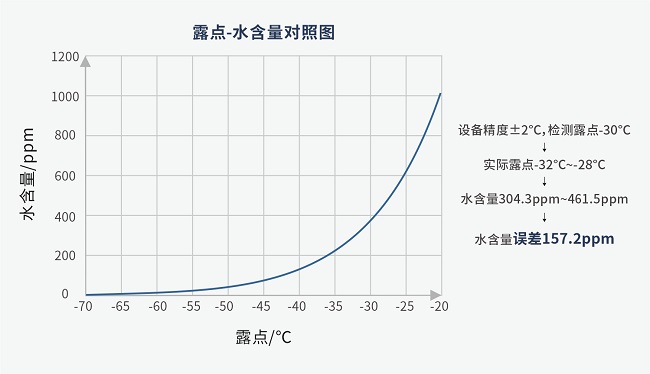 · 實(shí)際:露點(diǎn)與水含量呈非線性關(guān)系,露點(diǎn)越高,水含量差別越大。鋰電池車(chē)間露點(diǎn)通常在-60℃~-30℃,電容式傳感器檢測(cè)該區(qū)間誤差較大,如檢測(cè)露點(diǎn)為-30℃,水含量誤差高達(dá)157.2ppm。