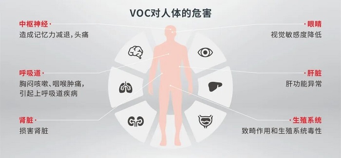 VOC的隱蔽性強,卻與健康息息相關(guān)。常見VOC包括苯、甲苯、二甲苯等,長期處于超標(biāo)環(huán)境將帶來多方面健康威脅: